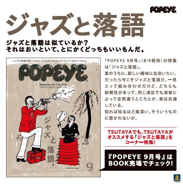 1976年の創刊以来、若者のファッション、カルチャー、ライフスタイルをリードし続ける雑誌『POPEYE』の「ジャズと落語」特集の発売(8月9日)を記念し、全国のTSUTAYA・蔦屋書店では、CDレンタルコーナーや書籍・雑誌コーナーで、同特集と連動した展開やイベントを実施。知れば知るほど奥深い「ジャズと落語」で和む夏を提案する。