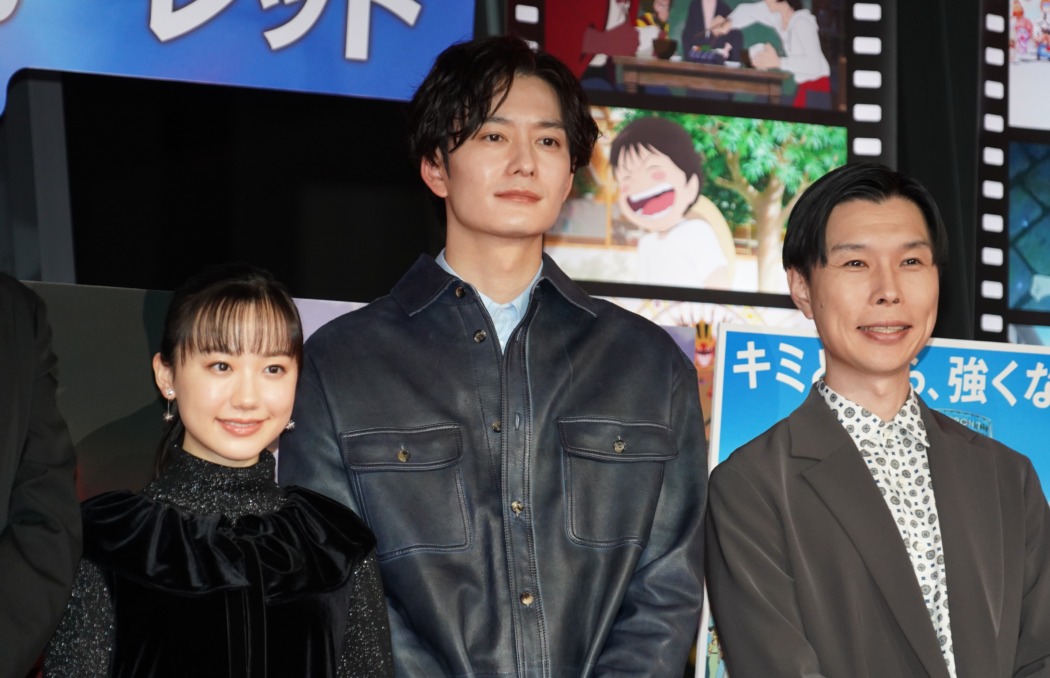 生年月日が一緒という上白石と高橋をはじめ、この日欠席となった木村柾哉(INI)を含め意気投合したというクワトロ主演の4人。中島が「現場はすごく盛り上がっていて笑いが絶えなかった。差し入れもすごくて、萌歌ちゃんはかき氷を、僕たちはそれに負けじと3人でカフェカーを差し入れました」と明かすと、高橋も「3人できれいに割りました、ちゃんと同じ額をはらえるように(笑)」。
