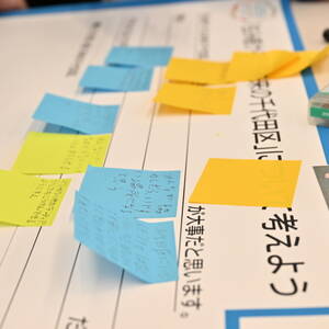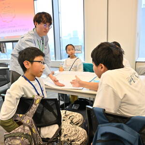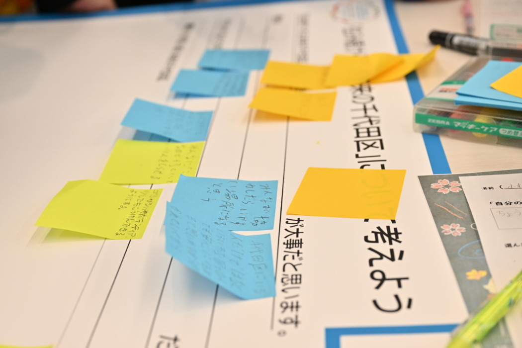 ワークショップでは「住み続けられる未来の千代田区」のためのアイデアについてディスカッション。まずはそれぞれが気づいた「千代田区の課題」を上げ、そこから課題解決のために何が必要か、アイデアをまとめ上げていく作業に挑戦。互いにアイデアを出し合い、意見を交わし、プレゼンテーションに向けて発表の仕方まで練り上げていく子どもたちの様子に、見守る大人たちも感心しきり。