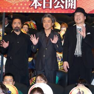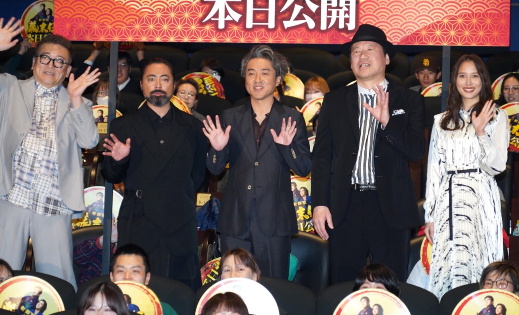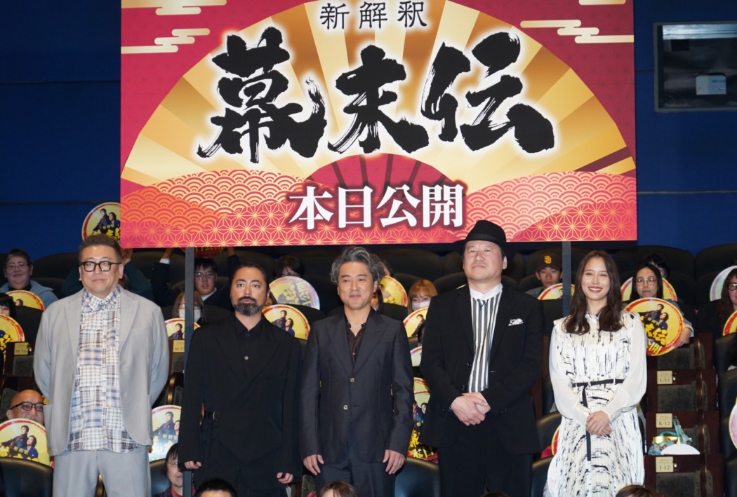 映画『新解釈・幕末伝』の初日舞台挨拶が12月19日、都内にて行われ、俳優のムロツヨシ、佐藤二朗、山田孝之、広瀬アリスと福田雄一監督が登壇。「自分の今年の漢字」というお題で暴走しようとする福田監督を、主演のムロと佐藤が止めようとする大波乱に観客が爆笑した。