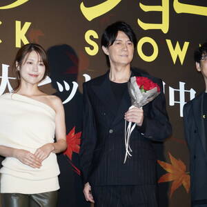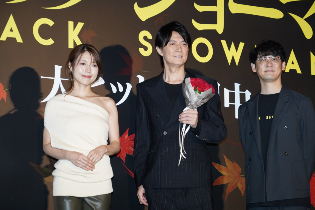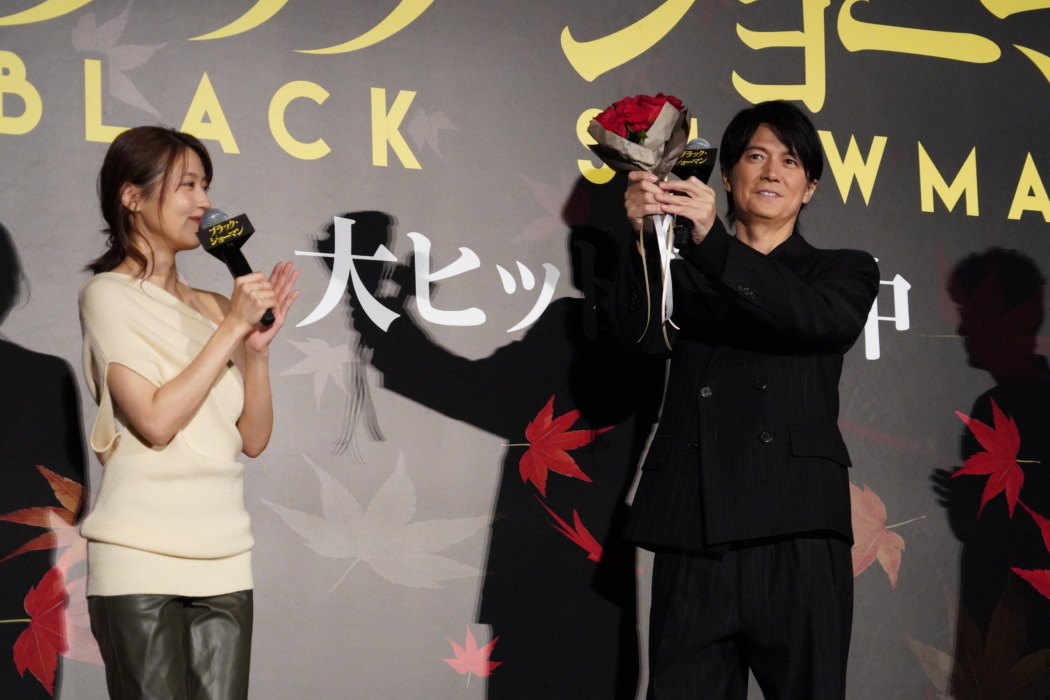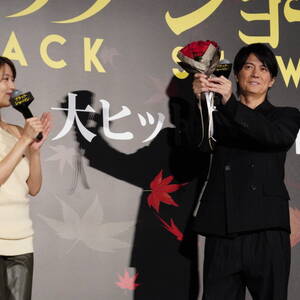 映画『ブラック・ショーマン』の大ヒット舞台挨拶が23日、都内にて行われ、俳優の福山雅治、有村架純と田中亮監督が登壇。福山が、作品の裏話を披露しリピート鑑賞をアピールした。